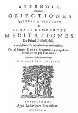 En 1641, Descartes publie les Méditations métaphysiques, déjà esquissées pendant les neuf premiers mois de son séjour en Hollande en 1629, et les Principes de la philosophie (1644). En 1641, il répond aux objections de Hobbes contre ses Méditations métaphysiques, publiées en latin, et il doit subir les premiers feux d'une longue controverse, dite « querelle d'Utrecht », lancée par le prédicateur Voetius. Les partisans de Voetius, en particulier son élève et prête-nom Schoock, accusent publiquement Descartes et son correspondant d'Utrecht, Henricus Regius de soutenir Copernic, de nommer l'âme un « accident ». Ils l'accusent également d'athéisme[33] et ils n'hésitent pas à pourfendre en chaire le philosophe, à réclamer qu'il subisse le sort réservé à Giulio Cesare Vanini, exécuté à Toulouse en 1619. Descartes fait alors intervenir l’université de Groningue et l’ambassadeur de France afin que cessent ces menaces.