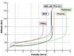 L’entrée dans l’atmosphère martienne à grande vitesse crée un plasma de CO2-N2, en opposition à O2-N2 pour l’atmosphère terrestre[2]. L’arrivée sur Mars est altérée par les effets du rayonnement de la chaleur produite par le CO2 et les poussières martiennes en suspension dans l’air[3].