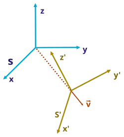 - ↑ C'est-à-dire que le mouvement du second référentiel se fait sans changement de direction des axes du repère d'espace associé.