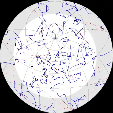| Ciel nocturne représenté pour un observateur couché sur le dos. Le zénith est au centre de l'image. Pour observer l'horizon dans une direction donnée: tourner l'image jusqu'à ce que la direction d'observation soit en bas, sous le zénith. | ||