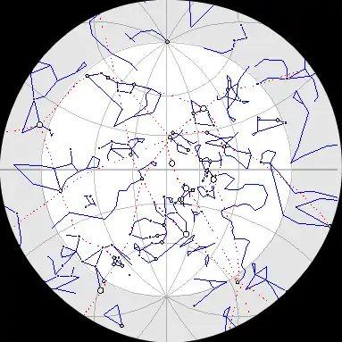 | Ciel nocturne représenté pour un observateur couché sur le dos. Le zénith est au centre de l'image. Pour observer l'horizon dans une direction donnée: tourner l'image jusqu'à ce que la direction d'observation soit en bas, sous le zénith. | ||