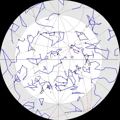 | Ciel nocturne représenté pour un observateur couché sur le dos. Le zénith est au centre de l'image. Pour observer l'horizon dans une direction donnée: tourner l'image jusqu'à ce que la direction d'observation soit en bas, sous le zénith. | ||