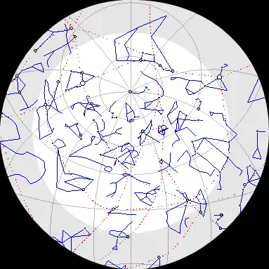 | Ciel nocturne représenté pour un observateur couché sur le dos. Le zénith est au centre de l'image. Pour observer l'horizon dans une direction donnée: tourner l'image jusqu'à ce que la direction d'observation soit en bas, sous le zénith. | ||