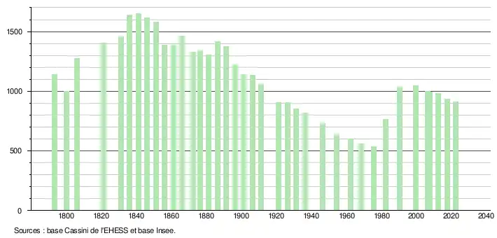 L'évolution du nombre d'habitants est connue à travers les recensements de la population effectués dans la commune depuis 1793. Pour les communes de moins de 10 000 habitants, une enquête de recensement portant sur toute la population est réalisée tous les cinq ans, les populations de référence des années intermédiaires étant quant à elles estimées par interpolation ou extrapolation[15]. Pour la commune, le premier recensement exhaustif entrant dans le cadre du nouveau dispositif a été réalisé en 2007[16].