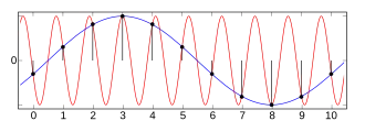 Au moment de la reconstitution, le filtre ne conserve que la sinusoïde dont la fréquence est inférieure à fe / 2. Ce n'est pas forcément celle du signal original. Notamment, si la fréquence du signal était supérieure à fe / 2, le filtre de reconstitution obtiendra la fréquence de différence (p = -1) f - fe (une fréquence négative est ici égale à la fréquence positive à la phase près).
