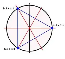Elle n'est pas fidèle et chaque isométrie du triangle possède quatre antécédents. La figure de droite illustre cette représentation. On a nommé les trois sommets du triangle au moyen des trois étiquettes 1×2 + 3×4, 2×3 + 1×4 et 1×3 + 2×4. Une permutation de S4 agit directement sur les chiffres de chaque étiquette. Ainsi, la transposition (12) laisse le sommet 1×2 + 3×4 invariant mais permute les deux sommets 2×3 + 1×4 et 1×3 + 2×4. On pourra vérifier que l'action de cette transposition est identique à celle de la transposition (34) ou celle des permutations circulaires (1324) ou (1423). Une telle action du groupe S4 est utilisée pour résoudre les équations du quatrième degré.