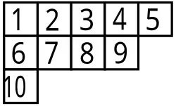 Un tableau de Young est obtenu en répartissant les entiers de 1 à n en lignes de longueur décroissante. On remplit ces lignes par les entiers de 1 à n, dans l'ordre. Cela revient à effectuer une partition de l'entier n, en notant sa décomposition sous forme décroissante. Ainsi, le tableau ci-contre correspond à une partition de l'entier 10 sous la forme 5 + 4 + 1. On le désignera sous la forme [ [1, 2, 3, 4, 5], [6, 7, 8, 9], [10] ]. Il correspond également au choix de la classe de conjugaison dans le groupe symétrique S10 formée des permutations ayant pour longueur de cycle respectivement 5, 4 et 1. En effet, deux permutations sont conjuguées si et seulement si leurs cycles à supports disjoints ont même longueur.