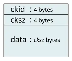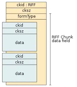 - data : Les données utiles (payload), contenues dans ce chunk. Dans le cas où les données sont de taille impaire — c'est-à-dire où le champ cksz contient une valeur impaire —, un octet nul est ajouté à la fin du champ de façon à conserver l'alignement dans le fichier[8].
