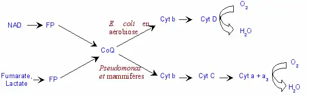 Les électrons de ces coenzymes passent sur une chaîne de transporteurs. Dans le cas d'une respiration aérobie, l'accepteur final est l'oxygène.