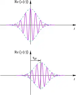 - Vitesse de groupe et vitesse de phase : On peut considérer la propagation d'une onde progressive comme l'action d'une ligne à retard dont la valeur du retard dépend de la position. Pour une onde monochromatique ce retard est avec le nombre d'onde, la vitesse de phase et la distance au plan dans la direction du vecteur d'onde. Dans ce cas la vitesse de phase est la distance divisé par le retard de phase. De même la vitesse de groupe est divisé par le temps de propagation de groupe.