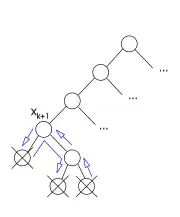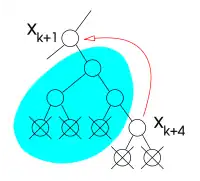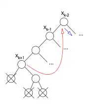 | Un exemple dans lequel l’affectation partielle courante de a été essayée sans succès pour toutes les valeurs possibles de . Le retour sur trace revient sur , en essayant de lui attribuer une nouvelle valeur. | Au lieu de retourner au niveau encore supérieur, l’algorithme élabore en démontrant qu’aucune des affectations , , et | En conséquence, l’affectation de ne conduit jamais à une solution non plus. L’algorithme revient alors directement à , en tentant de lui affecter une nouvelle valeur. |
