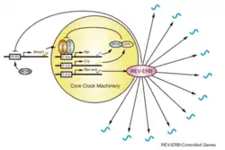 Dans le cycle circadien, la protéine REV-ERBα est en compétition avec la protéine RORα pour lier le promoteur des protéines BMAL1 et NPAS2 (NPAS2 est similaire à la protéine CLOCK). RORα active la transcription de BMAL1 et NPAS2. REV-ERBα vient inhiber l'action de RORα, et cela a pour conséquence d'inhiber la transcription des protéines BMAL1 et NPAS2[2],[3].