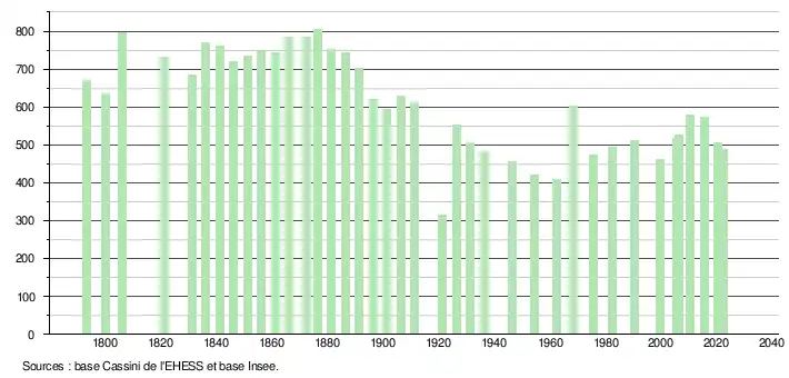 487 hab. (2022 en évolution de −14,26 % par rapport à 2016)