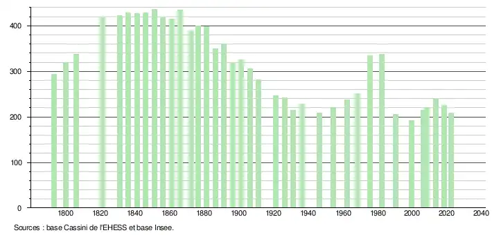 L'évolution du nombre d'habitants est connue à travers les recensements de la population effectués dans la commune depuis 1793. Pour les communes de moins de 10 000 habitants, une enquête de recensement portant sur toute la population est réalisée tous les cinq ans, les populations de référence des années intermédiaires étant quant à elles estimées par interpolation ou extrapolation[18]. Pour la commune, le premier recensement exhaustif entrant dans le cadre du nouveau dispositif a été réalisé en 2008[19].