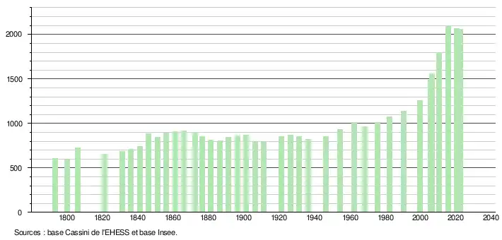 L'évolution du nombre d'habitants est connue à travers les recensements de la population effectués dans la commune depuis 1793. Pour les communes de moins de 10 000 habitants, une enquête de recensement portant sur toute la population est réalisée tous les cinq ans, les populations de référence des années intermédiaires étant quant à elles estimées par interpolation ou extrapolation[27]. Pour la commune, le premier recensement exhaustif entrant dans le cadre du nouveau dispositif a été réalisé en 2005[28].
