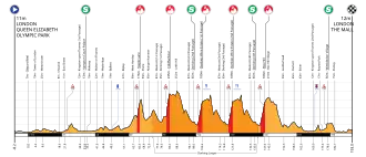 L'épreuve débute et s'achève à Londres, dans The Mall, près du Palais de Buckingham. Le parcours s'étend sur 140 kilomètres. À la suite du départ londonien, les coureurs disputent un parcours de 140,3 kilomètres entre la ville de Londres et le comté de Surrey. La course comporte deux difficultés dont la dernière se situe à 49 kilomètres de l'arrivée[1].