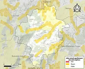 Le retrait-gonflement des sols argileux est susceptible d'engendrer des dommages importants aux bâtiments en cas d’alternance de périodes de sécheresse et de pluie[16]. 23,5 % de la superficie communale est en aléa moyen ou fort (27 % au niveau départemental et 48,5 % au niveau national métropolitain)[Carte 2]. Depuis le , en application de la loi ÉLAN, différentes contraintes s'imposent aux vendeurs, maîtres d'ouvrages ou constructeurs de biens situés dans une zone classée en aléa moyen ou fort[Note 2],[17].