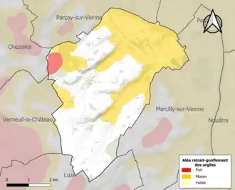 Le retrait-gonflement des sols argileux est susceptible d'engendrer des dommages importants aux bâtiments en cas d’alternance de périodes de sécheresse et de pluie. 43,4 % de la superficie communale est en aléa moyen ou fort (90,2 % au niveau départemental et 48,5 % au niveau national). Sur les 284 bâtiments dénombrés sur la commune en 2019, 34 sont en aléa moyen ou fort, soit 12 %, à comparer aux 91 % au niveau départemental et 54 % au niveau national. Une cartographie de l'exposition du territoire national au retrait gonflement des sols argileux est disponible sur le site du BRGM[19],[20].