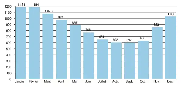 Sur la durée d'observation de 22 ans, le débit mensuel minimal a été de 411 m3/s (), tandis que le débit mensuel maximal s'élevait à 1 660 m3/s ().