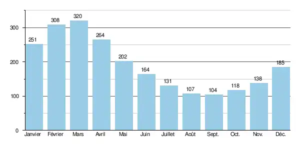 Sur la durée d'observation de 10 ans, le débit mensuel maximum observé a été de 569 m3/s (en janvier), tandis que le débit mensuel minimum se montait à 74 m3/s (en septembre), ce qui restait très confortable.