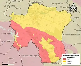 Le retrait-gonflement des sols argileux est susceptible d'engendrer des dommages importants aux bâtiments en cas d’alternance de périodes de sécheresse et de pluie. 99,7 % de la superficie communale est en aléa moyen ou fort (94,5 % au niveau départemental et 48,5 % au niveau national). Sur les 933 bâtiments dénombrés sur la commune en 2019, 929 sont en aléa moyen ou fort, soit 100 %, à comparer aux 93 % au niveau départemental et 54 % au niveau national. Une cartographie de l'exposition du territoire national au retrait gonflement des sols argileux est disponible sur le site du BRGM[26],[27].