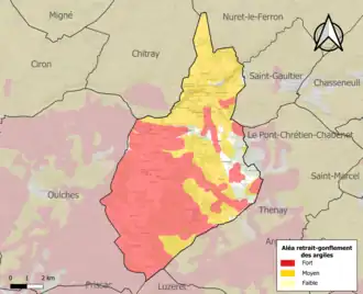 Le retrait-gonflement des sols argileux est susceptible d'engendrer des dommages importants aux bâtiments en cas d’alternance de périodes de sécheresse et de pluie. 93 % de la superficie communale est en aléa moyen ou fort (84,7 % au niveau départemental et 48,5 % au niveau national). Sur les 338 bâtiments dénombrés sur la commune en 2019, 324 sont en aléa moyen ou fort, soit 96 %, à comparer aux 86 % au niveau départemental et 54 % au niveau national. Une cartographie de l'exposition du territoire national au retrait gonflement des sols argileux est disponible sur le site du BRGM[22],[23].