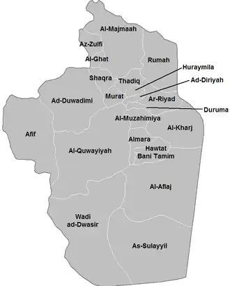 Outre la municipalité de Riyad, la province comprend 19 gouvernorats (muhafazat) et un sous-gouvernorat :