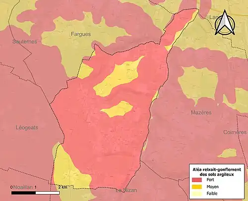 Le retrait-gonflement des sols argileux est susceptible d'engendrer des dommages importants aux bâtiments en cas d’alternance de périodes de sécheresse et de pluie. La totalité de la commune est en aléa moyen ou fort (67,4 % au niveau départemental et 48,5 % au niveau national). Sur les 695 bâtiments dénombrés sur la commune en 2019, 695 sont en aléa moyen ou fort, soit 100 %, à comparer aux 84 % au niveau départemental et 54 % au niveau national. Une cartographie de l'exposition du territoire national au retrait gonflement des sols argileux est disponible sur le site du BRGM[22],[Carte 2].