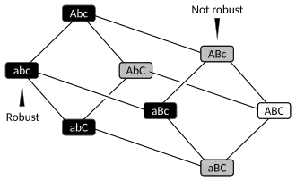 Le fait d'être robuste peut également être favorisé aux dépens de la valeur sélective totale dans une stratégie évolutivement stable (également appelée "survie du plus plat")[32]. Un pic fort mais étroit du paysage adaptatif[A 1] confère une valeur sélective forte mais une robustesse moindre car la plupart des mutations conduisent à une perte massive de valeur sélective. De forts taux de mutations peuvent favoriser une population avec des pics de fitness moins hauts mais plus larges. Des systèmes biologiques plus essentiels (organes ou tissus par exemple) peuvent aussi avoir une meilleure sélection de robustesse car les réductions de fonction sont plus dommageables pour la fitness[32]. On suppose que la robustesse mutationnelle est un moteur de la formation théorique des quasi-espèces virales.