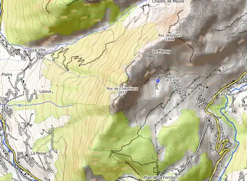 La montagne est constituée d'une dalle de calcaire urgonien[2] de forme rectangulaire, orientée selon un axe nord-est-sud-ouest et inclinée vers l'est[1]. Elle est délimitée sur deux de ses côtés, au nord-ouest et au sud-est, par des falaises où se trouve le point culminant à 1 877 mètres d'altitude sur le rebord Ouest de la montagne[1]. Des voies d'escalade se trouvent dans la falaise au-dessus du chalet de la Culaz à l'est[1]. Le roc de Charmieux domine le village d'Entremont situé à l'ouest dans la vallée du Borne[1]. Il constitue l'extrémité méridionale de la chaîne du Bargy, au sud-ouest du roc des Tours[1].
