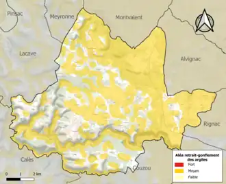 Le retrait-gonflement des sols argileux est susceptible d'engendrer des dommages importants aux bâtiments en cas d’alternance de périodes de sécheresse et de pluie. 62,9 % de la superficie communale est en aléa moyen ou fort (67,7 % au niveau départemental et 48,5 % au niveau national). Sur les 442 bâtiments dénombrés sur la commune en 2019, 234 sont en aléa moyen ou fort, soit 53 %, à comparer aux 72 % au niveau départemental et 54 % au niveau national. Une cartographie de l'exposition du territoire national au retrait gonflement des sols argileux est disponible sur le site du BRGM[39],[Carte 2].