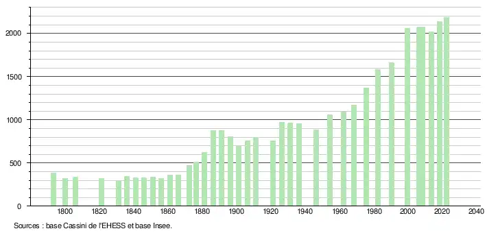 L'évolution du nombre d'habitants est connue à travers les recensements de la population effectués dans la commune depuis 1793. Pour les communes de moins de 10 000 habitants, une enquête de recensement portant sur toute la population est réalisée tous les cinq ans, les populations de référence des années intermédiaires étant quant à elles estimées par interpolation ou extrapolation[19]. Pour la commune, le premier recensement exhaustif entrant dans le cadre du nouveau dispositif a été réalisé en 2008[20].