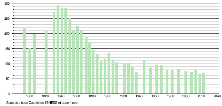 L'évolution du nombre d'habitants est connue à travers les recensements de la population effectués dans la commune depuis 1793. Pour les communes de moins de 10 000 habitants, une enquête de recensement portant sur toute la population est réalisée tous les cinq ans, les populations de référence des années intermédiaires étant quant à elles estimées par interpolation ou extrapolation[18]. Pour la commune, le premier recensement exhaustif entrant dans le cadre du nouveau dispositif a été réalisé en 2007[19].