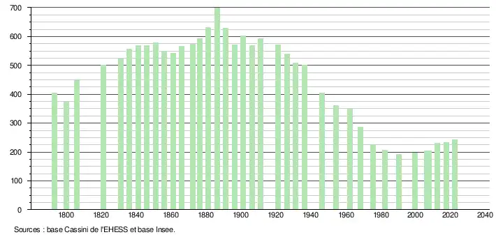 L'évolution du nombre d'habitants est connue à travers les recensements de la population effectués dans la commune depuis 1793. Pour les communes de moins de 10 000 habitants, une enquête de recensement portant sur toute la population est réalisée tous les cinq ans, les populations de référence des années intermédiaires étant quant à elles estimées par interpolation ou extrapolation[22]. Pour la commune, le premier recensement exhaustif entrant dans le cadre du nouveau dispositif a été réalisé en 2007[23].