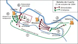 La pression almoravide ne cesse cependant pas, et au milieu de une armée de Abu Abdalá Muhammad ibn Tāšufīn, neveu de l'empereur Youssef ben Tachfine, arrive à Quart, à cinq kilomètres de Valence, et l'assiège, mais sera mise en déroute par le Cid en bataille rangée lors de la bataille de Quart (es)[26].