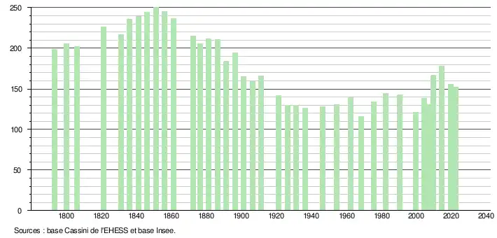 L'évolution du nombre d'habitants est connue à travers les recensements de la population effectués dans la commune depuis 1793. Pour les communes de moins de 10 000 habitants, une enquête de recensement portant sur toute la population est réalisée tous les cinq ans, les populations de référence des années intermédiaires étant quant à elles estimées par interpolation ou extrapolation[19]. Pour la commune, le premier recensement exhaustif entrant dans le cadre du nouveau dispositif a été réalisé en 2004[20].
