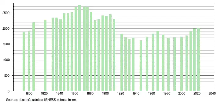 L'évolution du nombre d'habitants est connue à travers les recensements de la population effectués dans la commune depuis 1793. Pour les communes de moins de 10 000 habitants, une enquête de recensement portant sur toute la population est réalisée tous les cinq ans, les populations de référence des années intermédiaires étant quant à elles estimées par interpolation ou extrapolation[17]. Pour la commune, le premier recensement exhaustif entrant dans le cadre du nouveau dispositif a été réalisé en 2006[18].