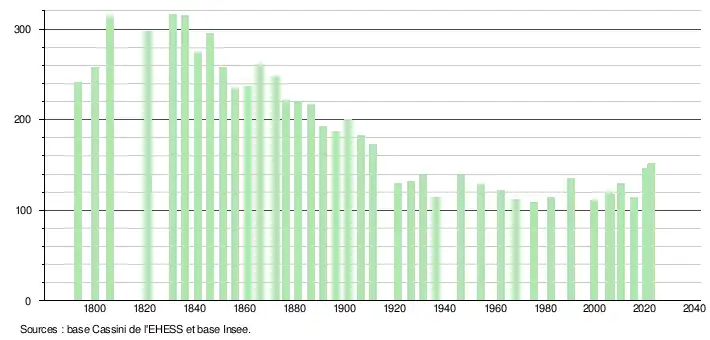 L'évolution du nombre d'habitants est connue à travers les recensements de la population effectués dans la commune depuis 1793. Pour les communes de moins de 10 000 habitants, une enquête de recensement portant sur toute la population est réalisée tous les cinq ans, les populations de référence des années intermédiaires étant quant à elles estimées par interpolation ou extrapolation[24]. Pour la commune, le premier recensement exhaustif entrant dans le cadre du nouveau dispositif a été réalisé en 2005[25].