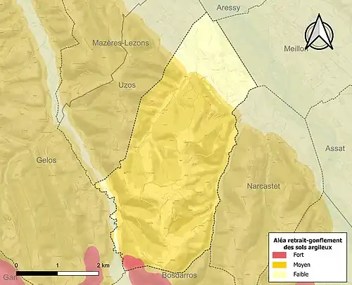 Le retrait-gonflement des sols argileux est susceptible d'engendrer des dommages importants aux bâtiments en cas d’alternance de périodes de sécheresse et de pluie[35]. 82,4 % de la superficie communale est en aléa moyen ou fort (59 % au niveau départemental et 48,5 % au niveau national)[Carte 6]. Depuis le , en application de la loi ELAN, différentes contraintes s'imposent aux vendeurs, maîtres d'ouvrages ou constructeurs de biens situés dans une zone classée en aléa moyen ou fort[Note 10],[36].