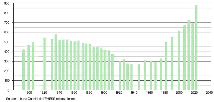 | L'évolution du nombre d'habitants est connue à travers les recensements de la population effectués dans la commune depuis 1793. Pour les communes de moins de 10 000 habitants, une enquête de recensement portant sur toute la population est réalisée tous les cinq ans, les populations de référence des années intermédiaires étant quant à elles estimées par interpolation ou extrapolation[26]. Pour la commune, le premier recensement exhaustif entrant dans le cadre du nouveau dispositif a été réalisé en 2007[27]. En 2022, la commune comptait 882 habitants[Note 3], en évolution de +25,46 % par rapport à 2016 (Haute-Garonne : +8,02 %, France hors Mayotte : +2,11 %). |