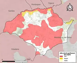 Le retrait-gonflement des sols argileux est susceptible d'engendrer des dommages importants aux bâtiments en cas d’alternance de périodes de sécheresse et de pluie. 66 % de la superficie communale est en aléa moyen ou fort (88,8 % au niveau départemental et 48,5 % au niveau national). Sur les 172 bâtiments dénombrés sur la commune en 2019, 105 sont en aléa moyen ou fort, soit 61 %, à comparer aux 98 % au niveau départemental et 54 % au niveau national. Une cartographie de l'exposition du territoire national au retrait gonflement des sols argileux est disponible sur le site du BRGM[22],[Carte 3].