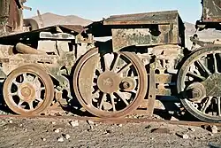 - la jante de bandage en contact avec le rail via son profil de roulement conique qui assure le rôle de différentiel en courbe[1];