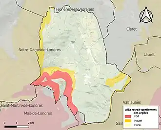 Le retrait-gonflement des sols argileux est susceptible d'engendrer des dommages importants aux bâtiments en cas d’alternance de périodes de sécheresse et de pluie. 19,7 % de la superficie communale est en aléa moyen ou fort (59,3 % au niveau départemental et 48,5 % au niveau national). Sur les 39 bâtiments dénombrés sur la commune en 2019, 24 sont en aléa moyen ou fort, soit 62 %, à comparer aux 85 % au niveau départemental et 54 % au niveau national. Une cartographie de l'exposition du territoire national au retrait gonflement des sols argileux est disponible sur le site du BRGM[22],[Carte 2].