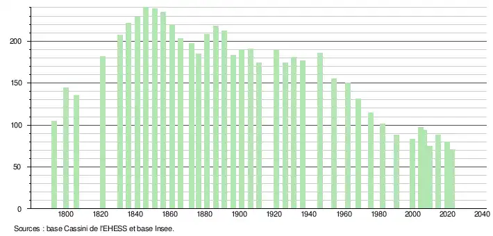 L'évolution du nombre d'habitants est connue à travers les recensements de la population effectués dans la commune depuis 1793. Pour les communes de moins de 10000habitants, une enquête de recensement portant sur toute la population est réalisée tous les cinqans, les populations de référence des années intermédiaires étant quant à elles estimées par interpolation ou extrapolation[30]. Pour la commune, le premier recensement exhaustif entrant dans le cadre du nouveau dispositif a été réalisé en 2004[31].