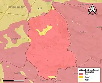 La commune est vulnérable au risque de mouvements de terrains constitué principalement du retrait-gonflement des sols argileux[23]. Cet aléa est susceptible d'engendrer des dommages importants aux bâtiments en cas d’alternance de périodes de sécheresse et de pluie. La totalité de la commune est en aléa moyen ou fort (76,3 % au niveau départemental et 48,5 % au niveau national). Sur les 269 bâtiments dénombrés sur la commune en 2019, 269 sont en aléa moyen ou fort, soit 100 %, à comparer aux 90 % au niveau départemental et 54 % au niveau national. Une cartographie de l'exposition du territoire national au retrait gonflement des sols argileux est disponible sur le site du BRGM[24],[Carte 3].