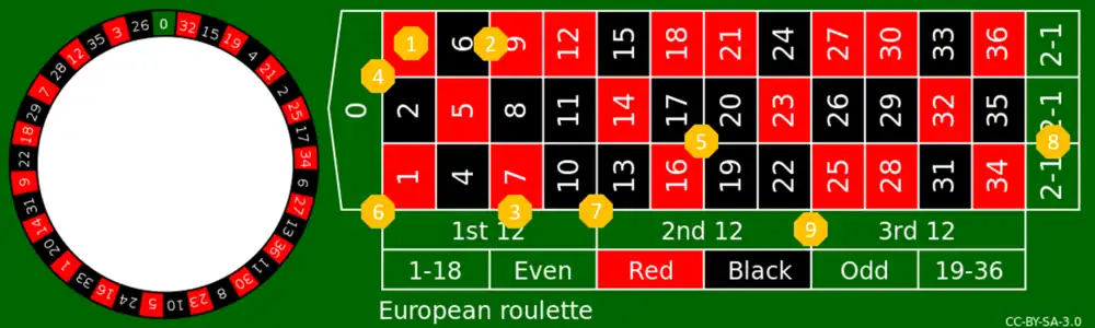 • La numérotation (cases noires, rouges ou vertes numérotées de 0 ou 00 à 36). Les numéros sont disposés de telle sorte qu'ils présentent une alternance parfaite permettant qu'aucun numéro ne partage avec l'un de ses voisins immédiats une de ses qualités simples (couleur, parité, hauteur) ;