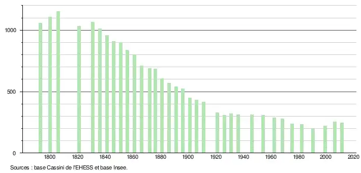 - ↑ Dans le tableau des recensements et le graphique, par convention dans Wikipédia, le principe a été retenu, pour les populations légales postérieures à 1999 de n’afficher dans le tableau des recensements et le graphique que les populations correspondant à l'année 2006, première population légale publiée calculée conformément aux concepts définis dans le décret no 2003-485 du 5 juin 2003, et les années correspondant à une enquête exhaustive de recensement pour les communes de moins de 10 000 habitants, ainsi que la dernière population légale publiée par l’Insee.