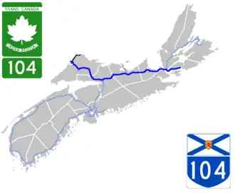 La route 104 est une route du nord de la Nouvelle-Écosse. Elle fait partie de la route Transcanadienne sur la majeure partie de son parcours. Avec sa longueur totale de319,4 km (198,5 mi), elle est la plus longue autoroute de la Nouvelle-Écosse. La route 104 adopte plusieurs formes, une autoroute, une autoroute à une seule chaussée et une route de transit avec deux voies et intersections à niveaux.
