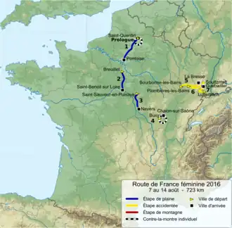 Le parcours s'élance à Saint Quentin par un prologue long de 3,2 kilomètres autour du parc des Champs Élysées[1]. S'ensuivent trois étapes relativement plates: entre Saint-Quentin et Pontoise, puis entre Breuillet et Saint-Benoît-sur-Loire, enfin entre Saint-Sauveur-en-Puisaye et Nevers . Un contre-la-montre individuel reliant Buxy à Chalon-sur-Saône et long de 15 km doit permettre d'ébaucher le classement général final. Trois étapes vallonnées voire de moyenne montagne concluent l'épreuve. La première va de Bourbonne-les-Bains à La Bresse avec un passage au col du Brabant à seulement trois kilomètres de l'arrivée. Le lendemain, le parcours entre Plombières-les-Bains et Soultzmatt comprend le col de la Croix des Moinats (8,8 km, 5,49% de pente moyenne, pente maximale 7,5%), le col du Bramont qui n'est pas référencé malgré ses 7,9 km à 4,05% de moyenne et 7,6% d'inclinaison maximale; Le Markstein (3,52% en moyenne, 8,6% maximum) et le col de Bannstein. Enfin la dernière étape se court en circuit entre Lutterbach et Guebwiller. Elle monte à trois reprises cette dernière difficulté[2],[3].