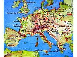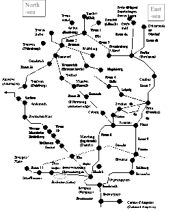 • Germanie. - Plusieurs routes connectaient la Mer du Nord à la Méditerranée. L'une empruntait l'Elbe et rejoignait Carnuntum par les villes d'Olmütz (Eburum) et Brno (Bruna). L'autre longeait la côte de la Mer du Nord par le pays des Bataves (sites de Baarn, Barneveld, Amersfoort et Amerongen) jusqu'à Amberes (l'actuelle Anvers), rattrapait Braine-l’Alleud et Braine-le-Comte, puis suivait la Meuse. Berne était un carrefour de routes venant des vallées du Rhône et du Rhin, et allant vers la plaine de Lombardie.